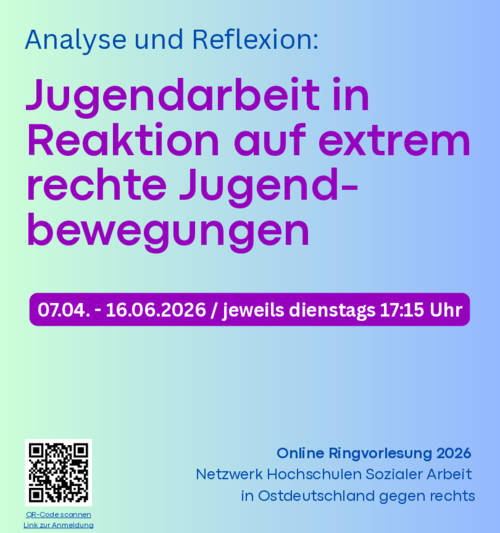 “Die Zunahme und Etablierung einer extrem rechten Jugendkultur stellt Gesellschaft und Soziale Arbeit vor Herausforderungen – insbesondere auch die Jugendarbeit. Allgemeine Fragen zu Hinwendungsmotiven und der Wirksamkeit von Präventionsarbeit, aber auch zu tradierten Erklärungsansätzen über Rechtsextremismus und Einstellungsmustern stellen sich (neu). […] Die Ringvorlesung will, neben aktuellen Analysen, Erfahrungen, Wissen und Strategien aus Praxis und Forschung der letzten 30 Jahre diskutieren. Dabei gehen wir auf einzelne Aspekte rechtsextremer Ideologie ein und diskutieren, welche Rolle Antifeminismus, Antisemitismus und Ableismus in der Sozialen Arbeit und für die Präventionsarbeit spielen. Wir tauschen uns über Erfahrungen und Strategien in der Jugendarbeit aus Praxis- und Forschungsperspektive aus. Zudem analysieren wir rechtsextreme Jugendkultur in analogen und digitalen Lebenswelten, schauen kritisch auf (vermeintliche) Neutralitätspflichten und thematisieren die Relevanz der Betroffenenperspektive im Kontext rechter Bedrohungen.” Hochschule Neubrandenburg